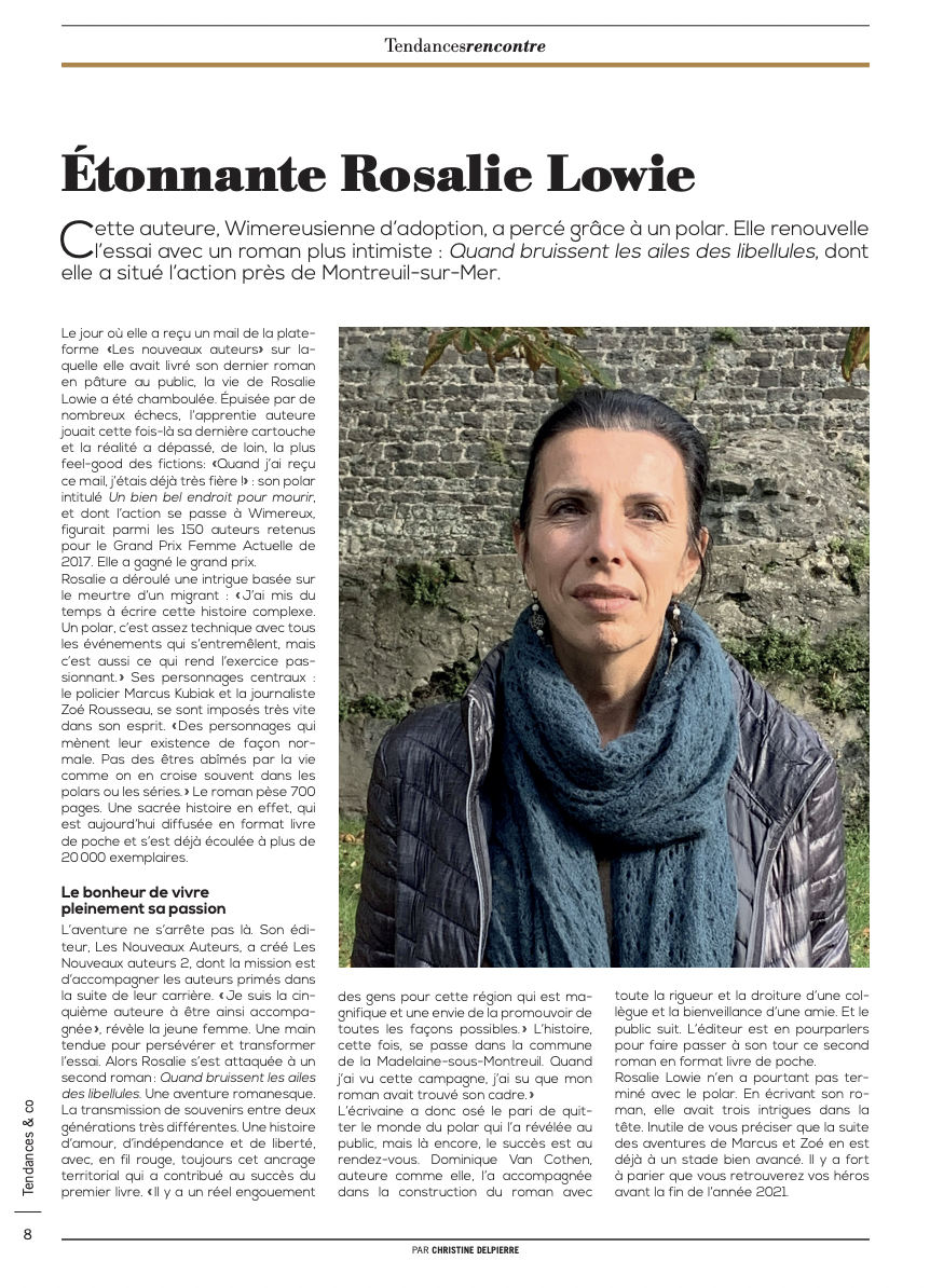 Le bonheur de vivre pleinement sa passion L’aventure ne s’arrête pas là. Son éditeur, Les Nouveaux Auteurs, a créé Les Nouveaux auteurs 2, dont la mission est d’accompagner les auteurs primés dans la suite de leur carrière. «Je suis la cinquième auteure à être ainsi accompagnée», révèle la jeune femme. Une main tendue pour persévérer et transformer l’essai. Alors Rosalie s’est attaquée à un second roman: Quand bruissent les ailes des libellules. Une aventure romanesque. La transmission de souvenirs entre deux générations très différentes. Une histoire d’amour, d’indépendance et de liberté, avec, en fil rouge, toujours cet ancrage territorial qui a contribué au succès du premier livre. «Il y a un réel engouement des gens pour cette région qui est magnifique et une envie de la promouvoir de toutes les façons possibles.» L’histoire, cette fois, se passe dans la commune de la Madelaine-sous-Montreuil. Quand j’ai vu cette campagne, j’ai su que mon roman avait trouvé son cadre.» L’écrivaine a donc osé le pari de quitter le monde du polar qui l’a révélée au public, mais là encore, le succès est au rendez-vous. Dominique Van Cothen, auteure comme elle, l’a accompagnée dans la construction du roman avec toute la rigueur et la droiture d’une collègue et la bienveillance d’une amie. Et le public suit. L’éditeur est en pourparlers pour faire passer à son tour ce second roman en format livre de poche. Rosalie Lowie n’en a pourtant pas terminé avec le polar. En écrivant son roman, elle avait trois intrigues dans la tête. Inutile de vous préciser que la suite des aventures de Marcus et Zoé en est déjà à un stade bien avancé. Il y a fort à parier que vous retrouverez vos héros avant la fin de l’année 2021.